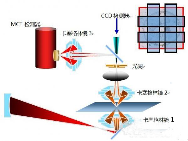 在紅外顯微鏡和紅外成像系統(tǒng)測(cè)試中,通過特殊設(shè)計(jì)的光學(xué)系統(tǒng)將測(cè)量光束直徑縮小到微米甚至亞微米量級(jí),從而可測(cè)試尺寸非常小的樣品或者是大尺寸樣品中非常小的區(qū)域,顯然此時(shí)光通量遠(yuǎn)遠(yuǎn)小于常規(guī)紅外光譜儀,若要獲得高的信噪比,對(duì)整體光學(xué)系統(tǒng)的光路系統(tǒng)要求相應(yīng)也有很大的很高,通常需要多個(gè)光學(xué)聚焦鏡(卡塞格林鏡)聯(lián)合使用,才能保證紅外光同軸,且能量損失最小,如圖1所示為PerkinElmer公司紅外光譜成像系統(tǒng)中的三卡塞格林鏡光學(xué)系統(tǒng)。