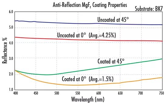 | MgF2 | λ/4 @ 550nm | Ravg?≤ 1.75% 400 - 700nm (N-BK7) | 10 J/cm2?@ 532nm, 10ns |