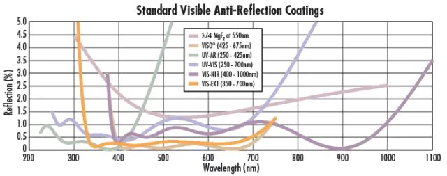 Edmund Optics?提供所有 TECHSPEC? 鏡頭與一個(gè)可選單層介電,增透膜降低表面反射。此外,我們現(xiàn)成的產(chǎn)品和大量定制訂單可提供自定義單層、多層、V 和 2V 膜。 View?Custom Optical Lens Coatings?for information
