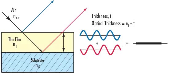 T該涂層的設(shè)計(jì),使相對(duì)相移在光束反射在薄膜上、下邊界180度之間偏移。破壞性干擾發(fā)生在兩反射光束之間,在它們退出表面之前才同時(shí)取消。鍍膜的光學(xué)厚度必須是四分之一波長(zhǎng)的奇數(shù)(1 / 4,其中L是設(shè)計(jì)波長(zhǎng)或峰值性能的優(yōu)化波長(zhǎng)),以實(shí)現(xiàn)反射光束之間一個(gè)半波長(zhǎng)所需的路徑差異,從而導(dǎo)致其取消。