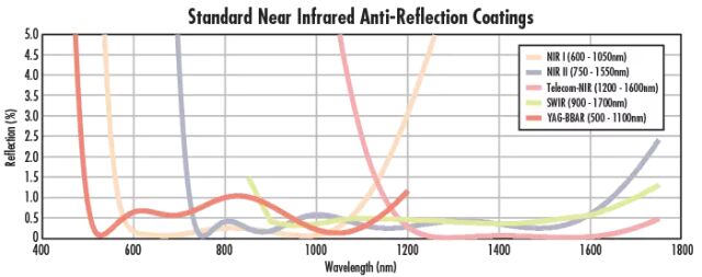 NIR I 和 NIR II:?我們的近紅外 I 和近紅外 II 寬帶增透膜在常見(jiàn)光纖、激光二極管模塊和 LED 燈的近紅外波長(zhǎng)方面提供卓越的性能。