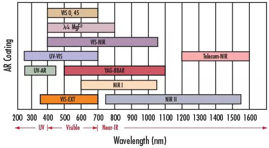 透射光學(xué)元件與增透膜可通過(guò)增加透射、增強(qiáng)對(duì)比度及消除鬼影,從而大幅改善光學(xué)效率。多數(shù)增透膜都十分持久耐用,且能夠抵抗物理和環(huán)境損壞?;谶@些原因,絕大多數(shù)投射性光學(xué)包括一些增透膜的形式。當(dāng)制定適于您特定應(yīng)用的增透膜時(shí),您必須首先充分認(rèn)識(shí)到了解您系統(tǒng)的全部光譜范圍。雖然增透膜能顯著提高光學(xué)系統(tǒng)性能,但若在設(shè)計(jì)波長(zhǎng)范圍外的波長(zhǎng)使用鍍膜,則會(huì)大幅降低系統(tǒng)性能。