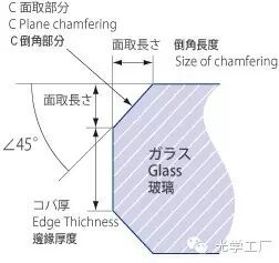 光學(xué)零件圖上一般用圖形和文字表明倒角要求。若圖面上的倒角尺寸小于2毫米時,一般不繪制出實際倒角圖形,只需在倒角處引出細實線,標(biāo)注其倒角尺寸,不允許倒角的棱線,應(yīng)用細實線引出,并注明“尖棱”,(我們現(xiàn)在一般標(biāo)注的是“倒脊不可”。)若在同一圖形上所有或部分倒角尺寸均相同時,則只需用文字在技術(shù)要求中注明“全部倒角××”或“其余倒角××”“未注倒角××”。