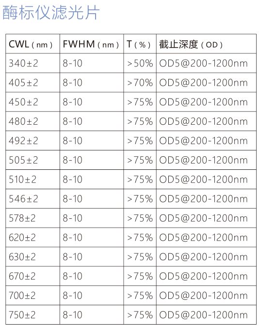 標(biāo)準(zhǔn)的酶標(biāo)儀濾光片廣泛應(yīng)用于熒光檢測設(shè)備,工業(yè)、科研分析儀器,刑偵設(shè)備以及生物化學(xué)分析儀器等方面。