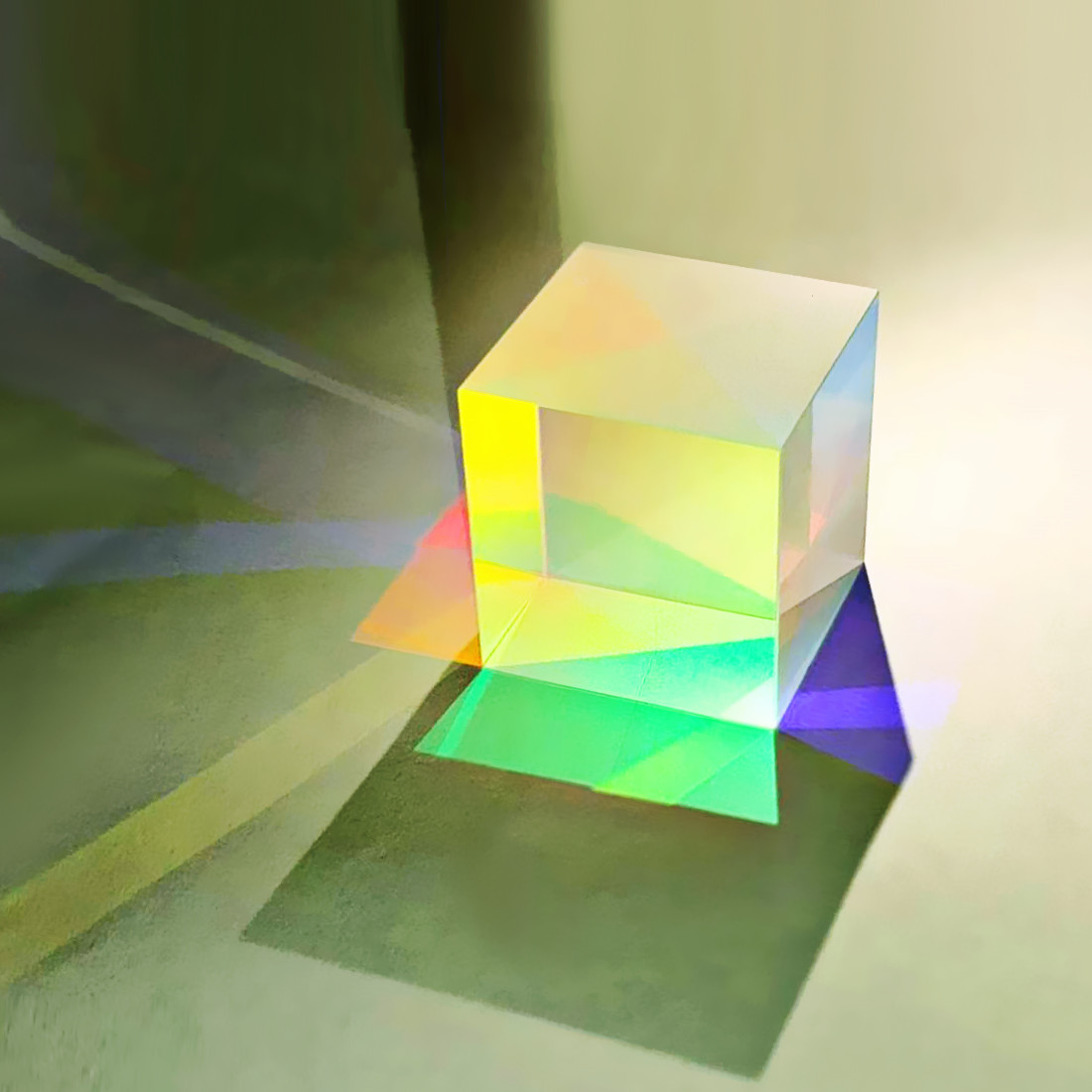 從上邊來(lái)看,合色棱鏡對(duì)光具有分光和折射的作用。當(dāng)我們使用白光照射時(shí),棱鏡通過(guò)折射使不同波長(zhǎng)(即顏色)的光分開(kāi),再加上不同反射膜的反射作用,最終呈現(xiàn)出漂亮的光學(xué)現(xiàn)象。