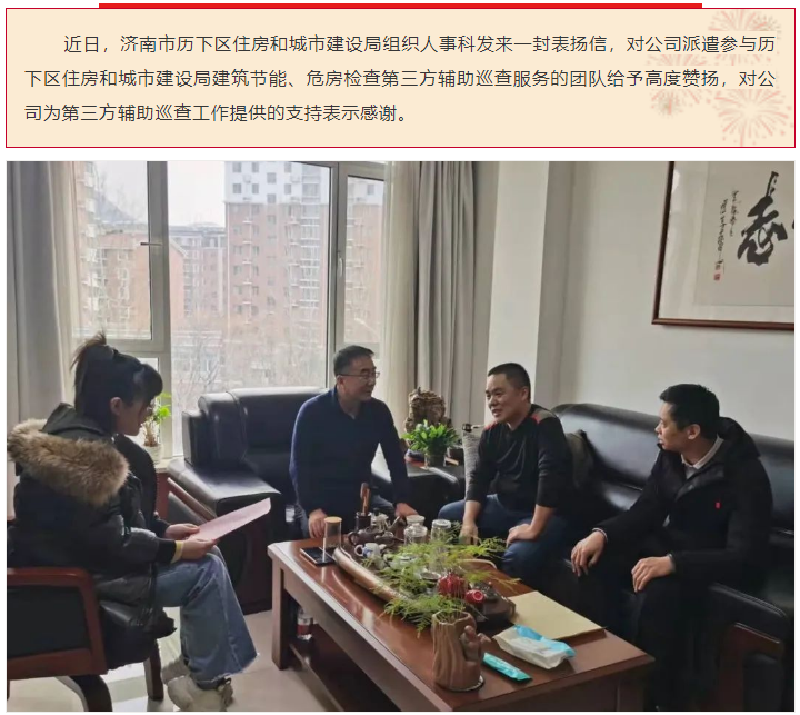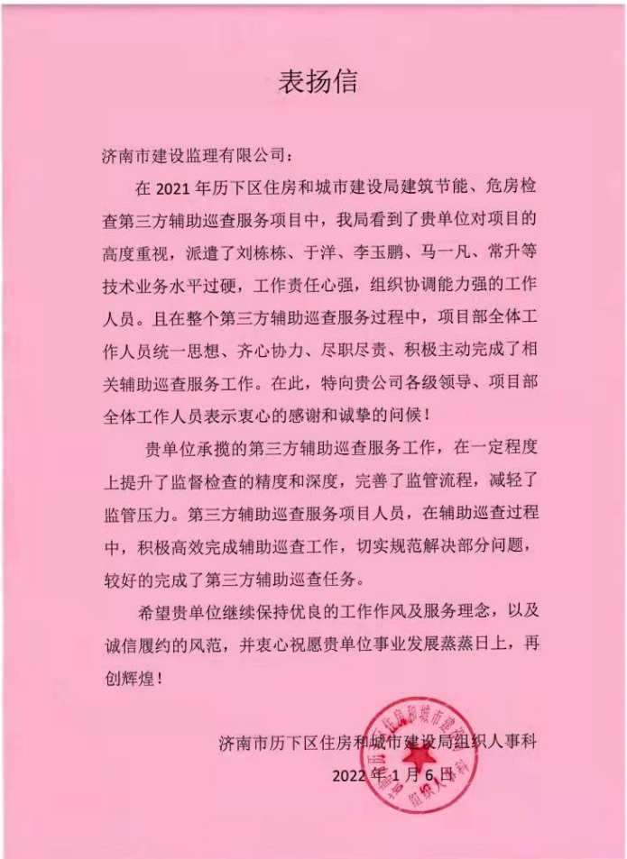 點贊!公司第三方輔助巡查服務(wù)團隊獲歷下區(qū)住房和城市建設(shè)局組織人事科來信表揚