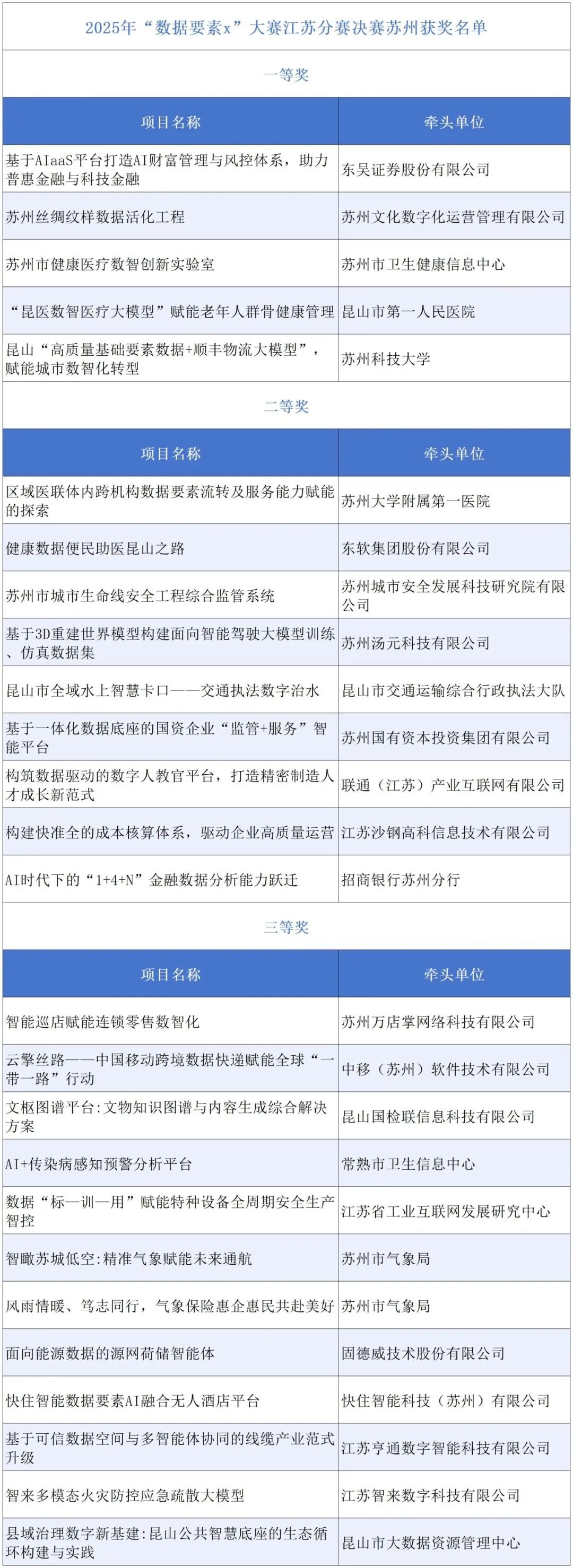 2025年“數(shù)據(jù)要素×”大賽江蘇省分賽決賽結(jié)果公布,蘇州工業(yè)園區(qū)共有2個(gè)項(xiàng)目獲獎(jiǎng),其中1個(gè)項(xiàng)目獲得一等獎(jiǎng),將有機(jī)會(huì)推薦參加2025年“數(shù)據(jù)要素×”大賽全國(guó)總決賽。