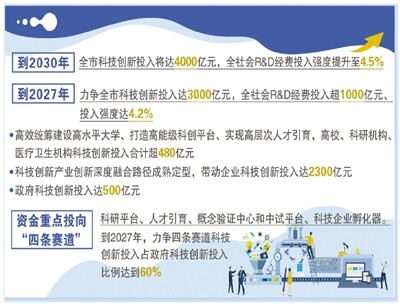 創(chuàng)新活力之城的持續(xù)進(jìn)位,離不開科技創(chuàng)新的持續(xù)投入?!斗桨浮窐?gòu)建了階梯式發(fā)展目標(biāo):到2027年,科技創(chuàng)新投入機(jī)制更加健全,力爭全市科技創(chuàng)新投入達(dá)3000億元,全社會(huì)R&D經(jīng)費(fèi)投入超1000億元、投入強(qiáng)度達(dá)4.2%。高效統(tǒng)籌建設(shè)高水平大學(xué)、打造高能級科創(chuàng)平臺(tái)、實(shí)現(xiàn)高層次人才引育,高校、科研機(jī)構(gòu)、醫(yī)療衛(wèi)生機(jī)構(gòu)科技創(chuàng)新投入合計(jì)超480億元;科技創(chuàng)新產(chǎn)業(yè)創(chuàng)新深度融合路徑成熟定型,帶動(dòng)企業(yè)科技創(chuàng)新投入達(dá)2300億元;科技創(chuàng)新投入牽動(dòng)的創(chuàng)新環(huán)境持續(xù)優(yōu)化。政府科技創(chuàng)新投入達(dá)500億元,投入效能不斷提升,形成良好創(chuàng)新生態(tài)。
