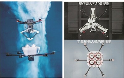 這套系統(tǒng)由一架工具箱無人機(jī)和一架操作無人機(jī)組成。工具箱無人機(jī)能攜帶多種不同類型的末端執(zhí)行工具,如爪子、剪刀等,可以想象為裝滿各種手術(shù)器械的托盤;操作無人機(jī)是擁有可伸展機(jī)械臂的“操作手”,可以想象為主刀醫(yī)生。工作時(shí),操作無人機(jī)飛到工具箱無人機(jī)上方,靈活拾取各種工具,完成任務(wù)后放回原處,再換一個(gè)工具接著手術(shù)。