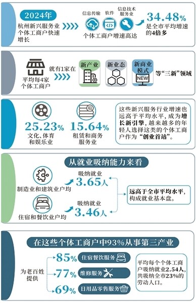 作為“全國數(shù)字經(jīng)濟第一城”,杭州的數(shù)字經(jīng)濟優(yōu)勢在個體經(jīng)濟領(lǐng)域都很明顯。報告顯示,2024年杭州新興服務(wù)業(yè)個體工商戶快速增長,信息傳輸、軟件和信息技術(shù)服務(wù)業(yè)個體工商戶增速高達34.48%,是全市平均增速的4倍多。平均每4家個體工商戶就有1家在新產(chǎn)業(yè)、新業(yè)態(tài)、新商業(yè)模式等“三新”領(lǐng)域(涵蓋數(shù)字經(jīng)濟、智慧農(nóng)業(yè)、沉浸式文旅等前沿領(lǐng)域)。文化、體育和娛樂業(yè)(25.23%),租賃和商務(wù)服務(wù)業(yè)(15.64%)等新興服務(wù)行業(yè)增速也遠高于平均水平,成為增長新引擎,越來越多的年輕人選擇這類的個體工商戶作為“創(chuàng)業(yè)首站”。