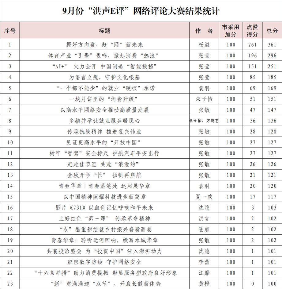 9月份,“洪聲E評”網(wǎng)絡(luò)評論大賽共計收到網(wǎng)評33篇,累計報送稿件23篇,市辦采用22篇?!昂槁曕诹痢惫娞栒共ゾW(wǎng)評稿件23篇,綜合采用情況和公眾號統(tǒng)計情況如下: