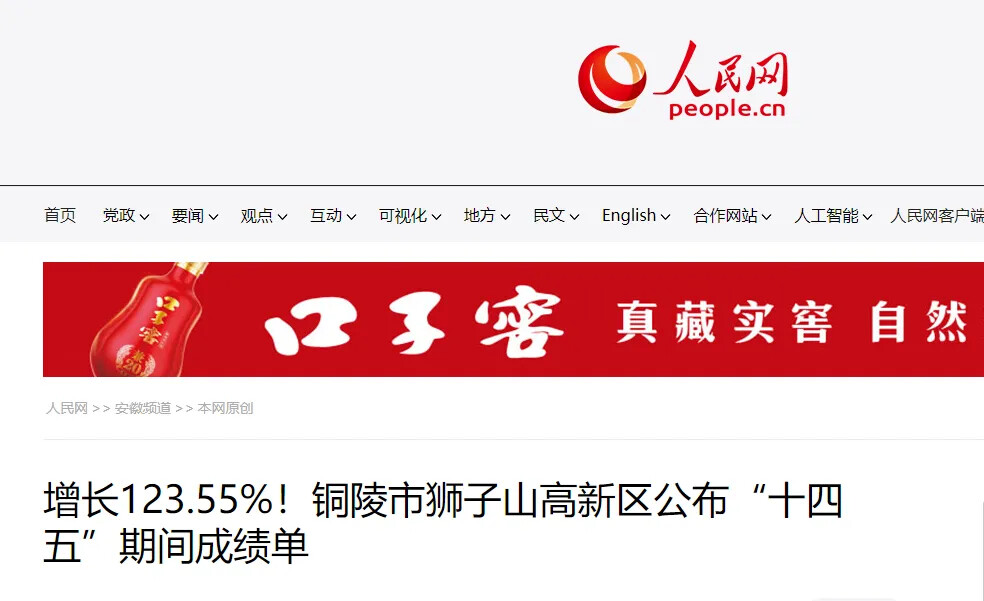 人民網(wǎng)安徽頻道以《增長123.55%!銅陵獅子山高新區(qū)公布“十四五”期間成績單》為題,報道銅官區(qū)獅子山高新區(qū)經(jīng)濟綜合實力跨越式提升。