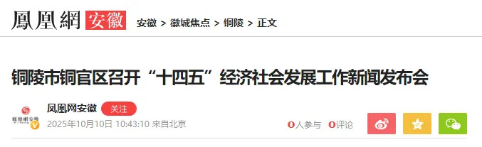 鳳凰網(wǎng)以《銅陵市銅官區(qū)召開“十四五”經(jīng)濟社會發(fā)展工作新聞發(fā)布會》為題,專題報道銅官區(qū)召開“十四五”經(jīng)濟社會發(fā)展工作新聞發(fā)布會情況,集中展示銅官區(qū)“十四五”期間立足五大發(fā)展平臺、圍繞“五個倍增”行動所取得的豐碩成果和亮點成效。